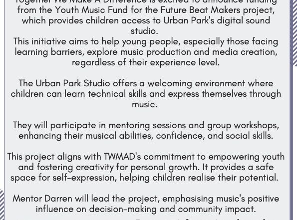 TWMAD Celebrates Youth Music Fund Award for Future Beat Makers Project Together We Make A Difference is thrilled to announce that we have been granted funding from the Youth Music Fund to launch our innovative [...]